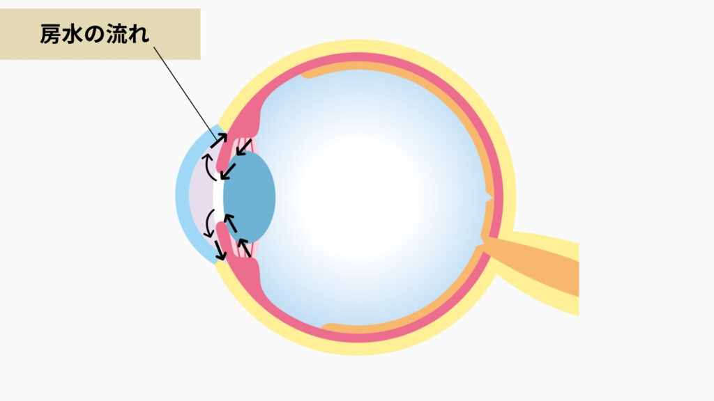 目の中には「房水(ぼうすい)」という透明な液体が常に流れています。目の中をゆっくり循環して、目の中に栄養を届け、老廃物を運び出す仕事をしています。